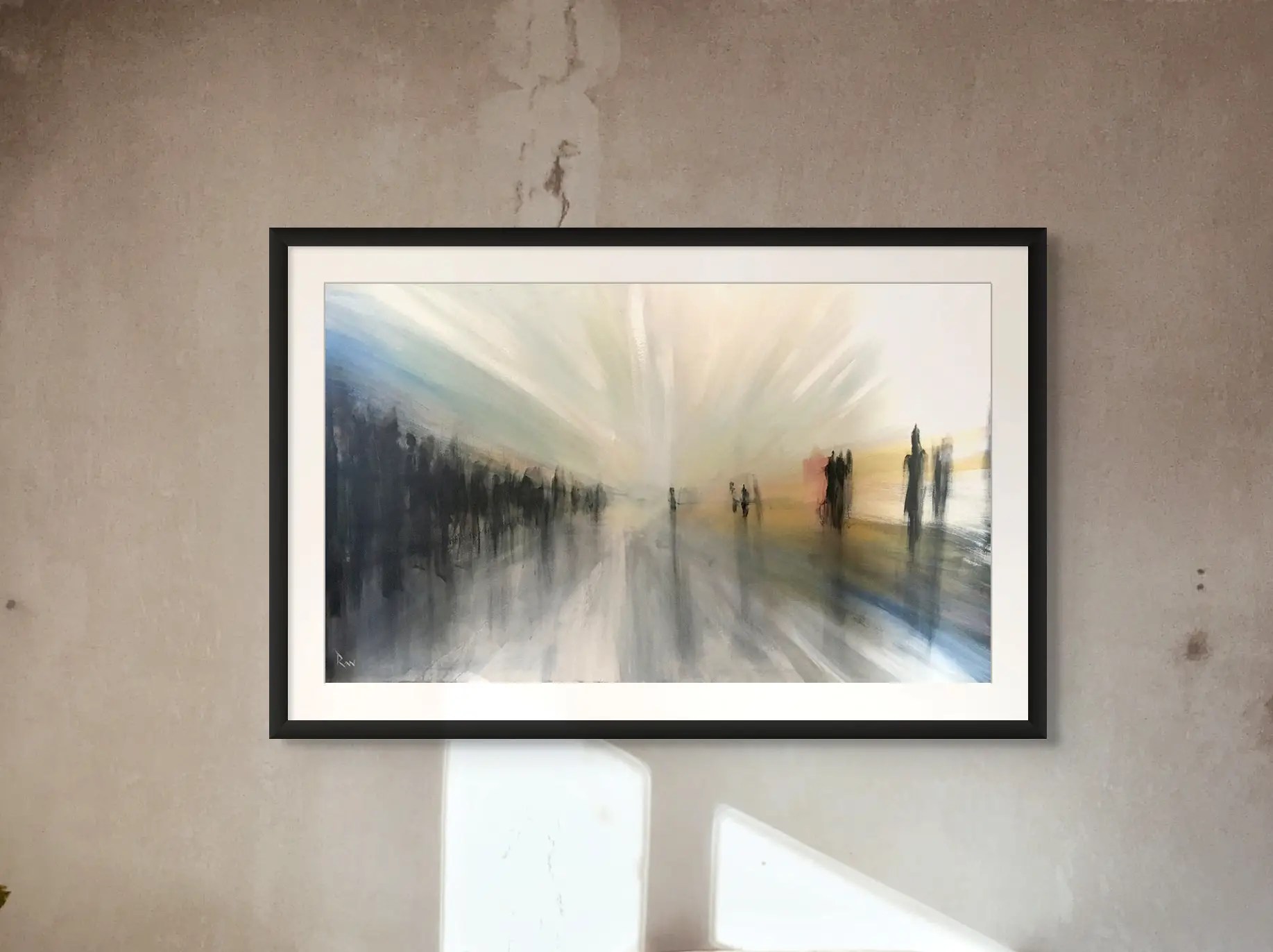 The figures depicted through abstract silhouettes, represent the various stages of proximity and distance we experience in our search for purpose. They blend into the environment, highlighting the ephemeral nature of our identities and the places we occupy.